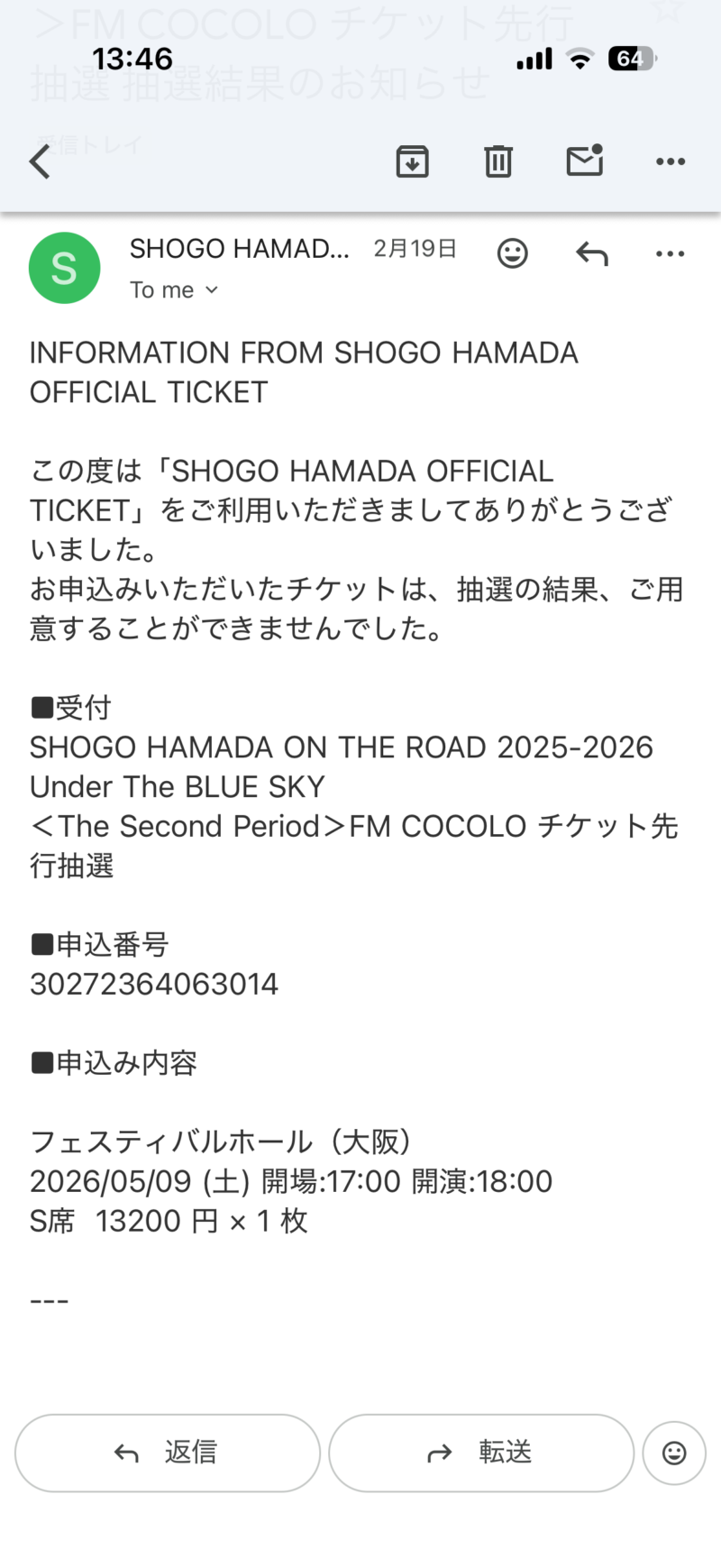 「SHOGO HAMADA ON THE ROAD 2025-2026 Under The BLUE SKY」FM COCOLOリスナーに先行抽選受付の記事を見つけ、わくわくで応募していました😄